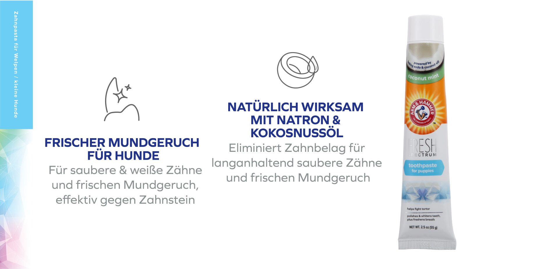 Mit der Arm & Hammer Fresh Zahnpasta mit Kokosnuss-Minze-Geschmack für Welpen wird das Zähneputzen schnell zur Routine. Der angenehme Geschmack unserer Zahnpasta macht es zu einer positiven Erfahrung für deinen Welpen und du kannst frische Hundebussis genießen.