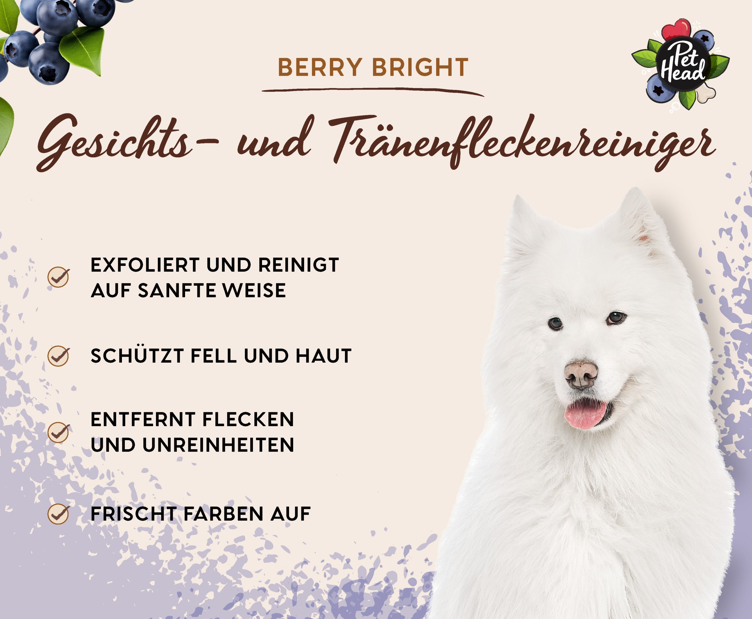 Angereichert mit einem Feigenkaktus-Extrakt, der sanft exfoliert und die Zellenerneuerung steigert, hilft der Berry Bright Facial & Tear Stain Remover, das Fell deines Hundes fleckenfrei, sauber und gesund zu halten.