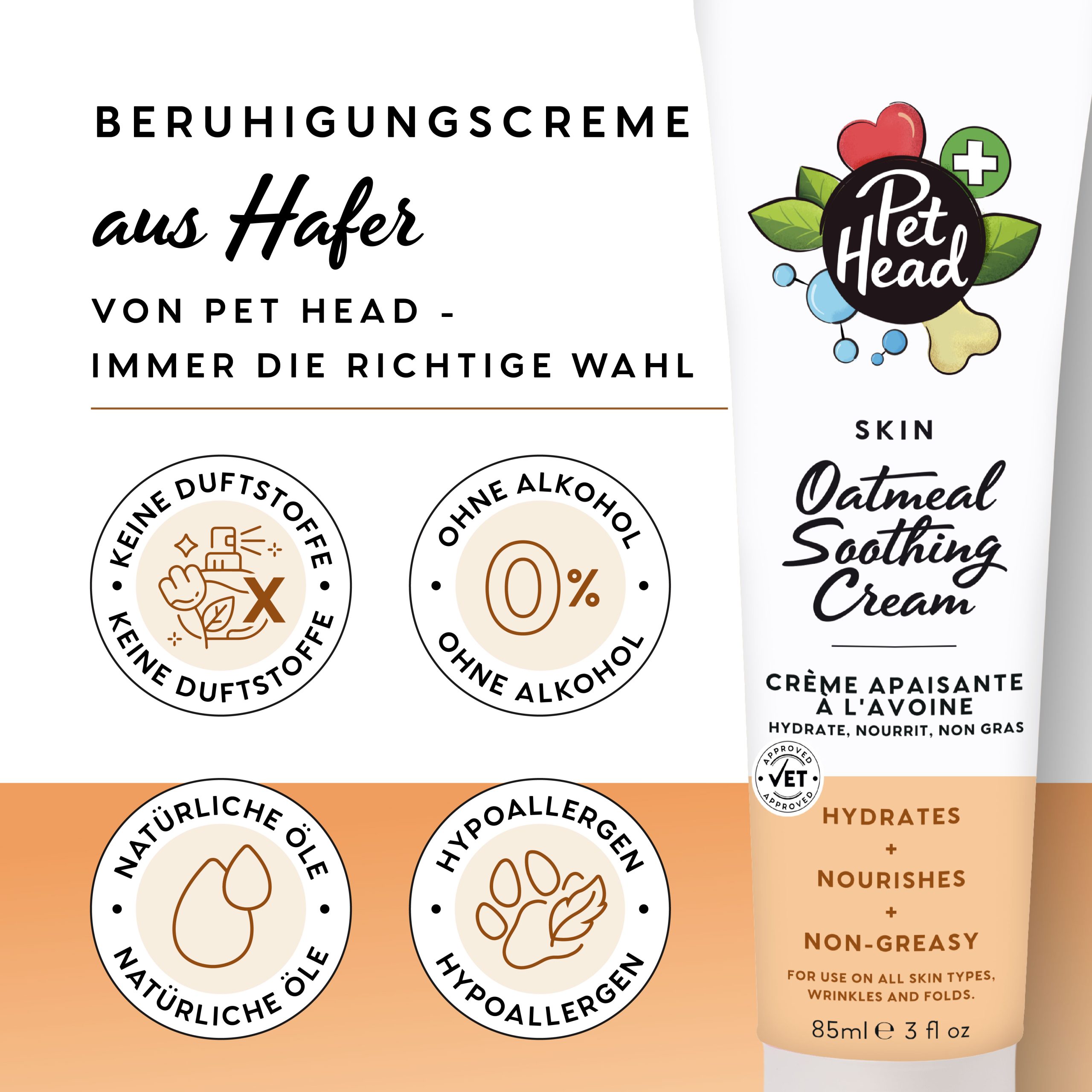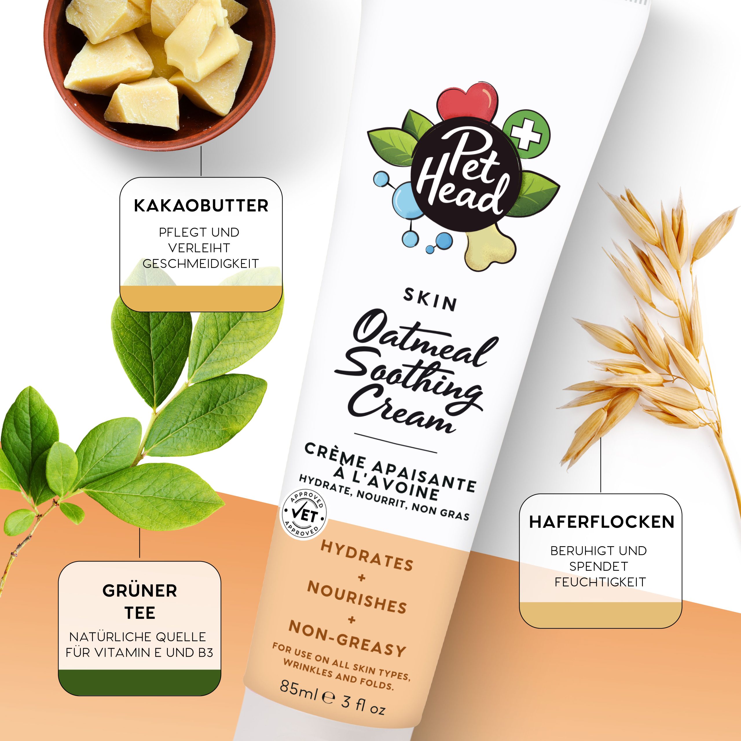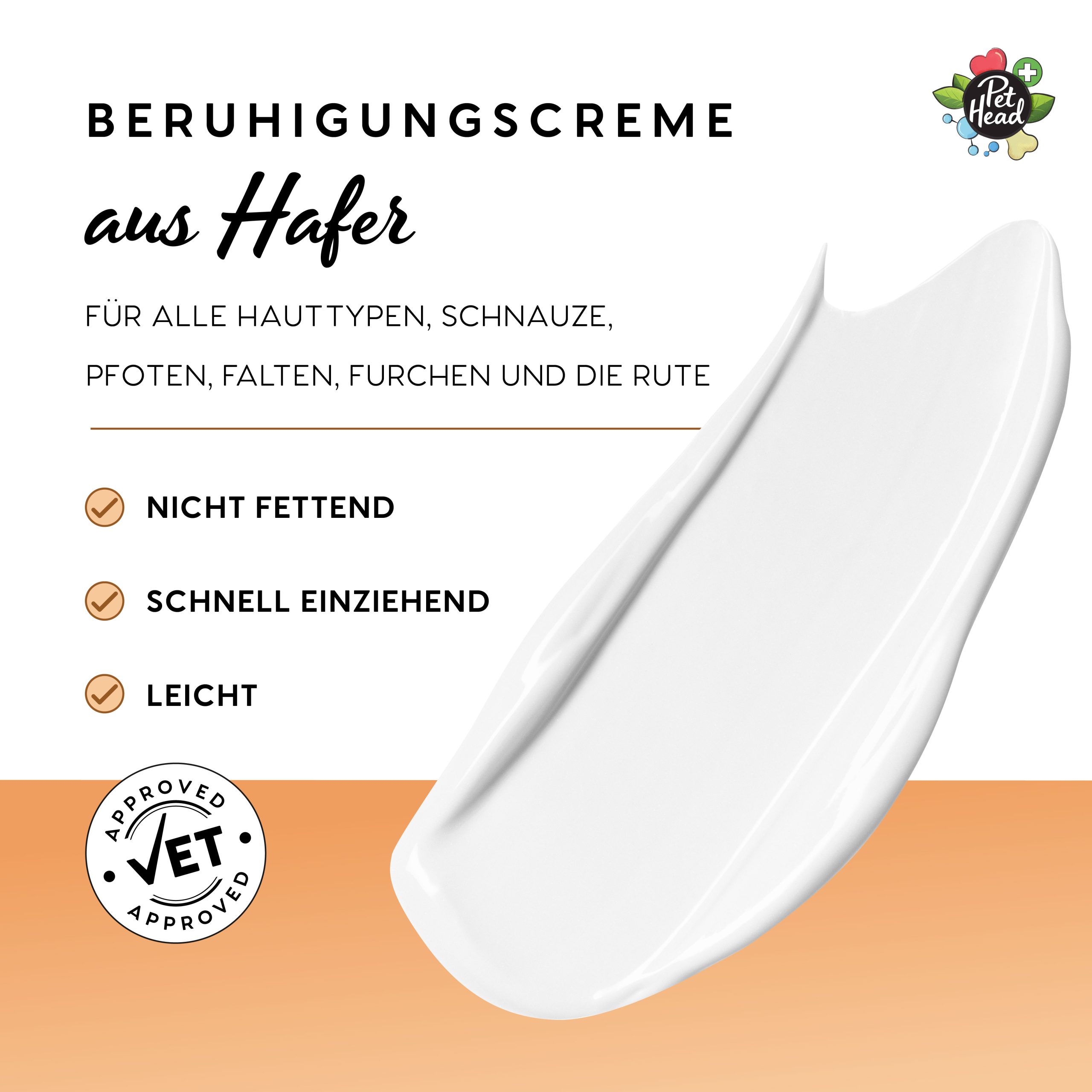 Am sichersten ist es, eine sanfte, pH-ausgeglichene Creme zu verwenden, die speziell für die Bedürfnisse der Hundehaut entwickelt wurde. Die Pet Head Hafermehl-Beruhigungscreme wurde mit kosmetischen Inhaltsstoffen formuliert, die speziell auf die pH-Balance und die besonderen Anforderungen der Hundehaut abgestimmt sind.