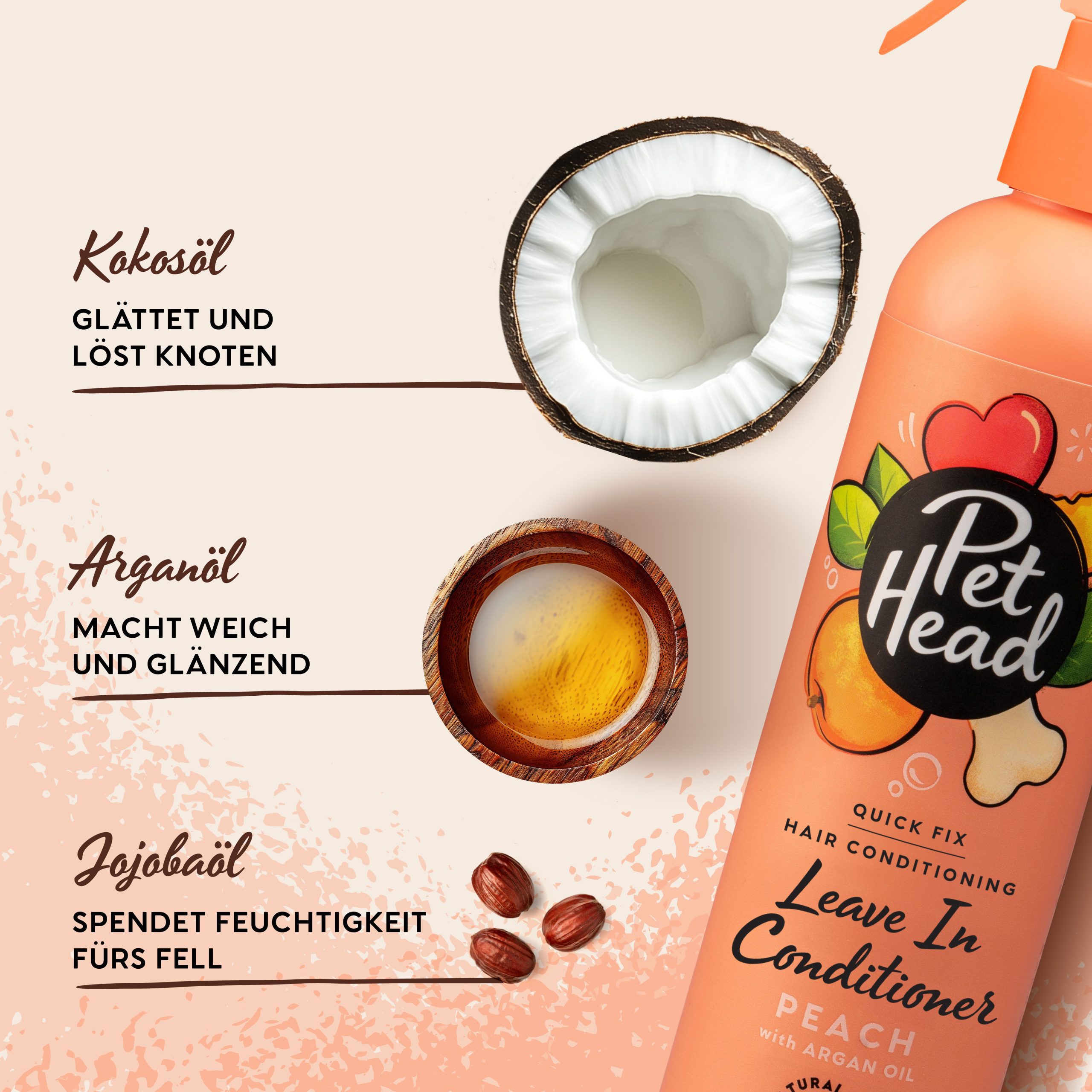 Ein leichter, vielseitiger Leave-in-Conditioner für Hunde. Die Pflegespülung ohne Ausspülen spendet langanhaltende Feuchtigkeit für Haut und Fell, revitalisiert stumpfes, kraftloses Haar und verleiht einen unwiderstehlichen Pfirsichduft. Sie entwirrt das Fell sofort, glättet abstehende Haare und erleichtert das Bürsten oder Kämmen. Kann auf nassem oder trockenem Fell angewendet werden – Ausspülen ist nicht erforderlich.