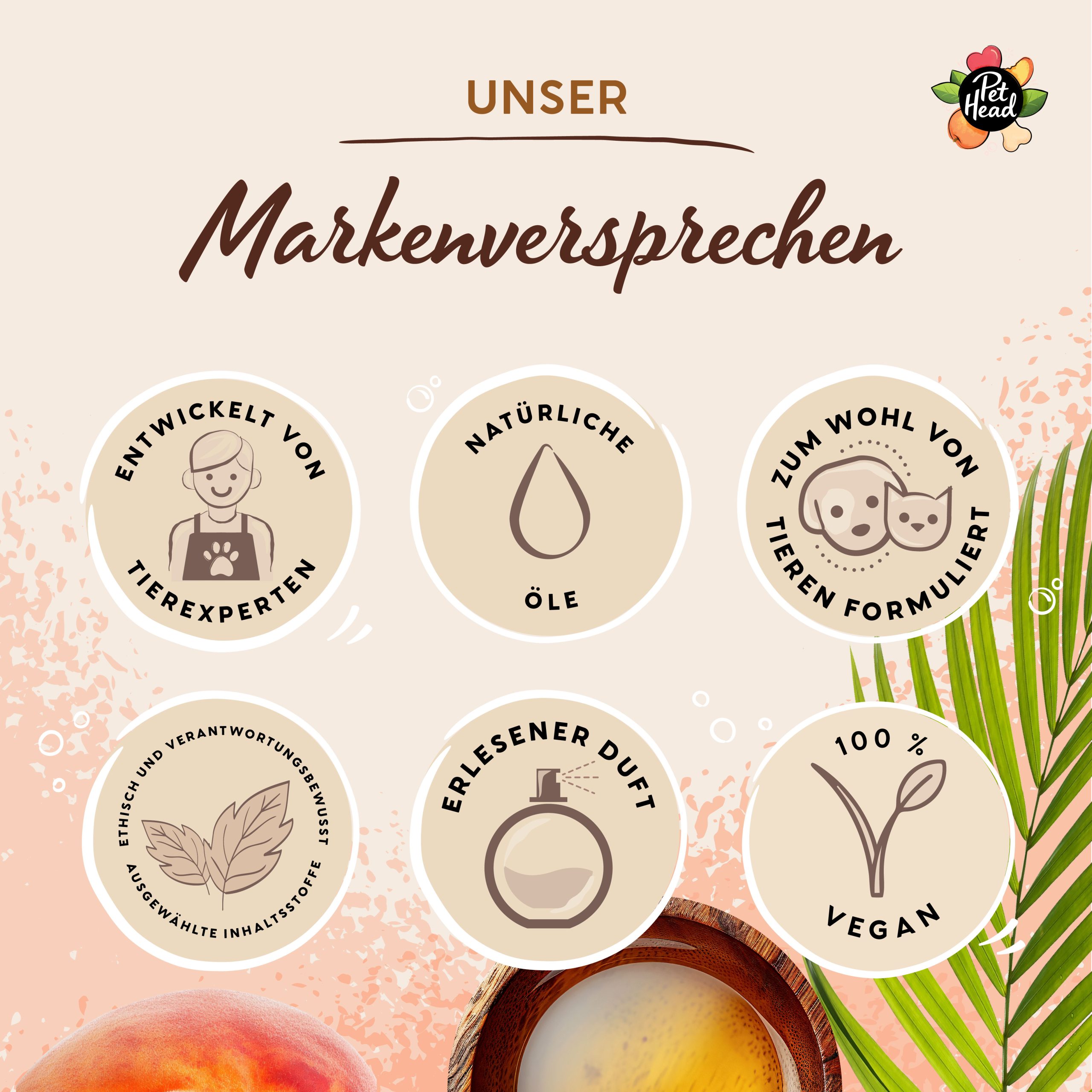 Unser wunderbarer Pfirsichduft verleiht dem Fell eine fruchtige, süße und pudrige Note und sorgt für ein Gefühl von Sanftheit und Frische.