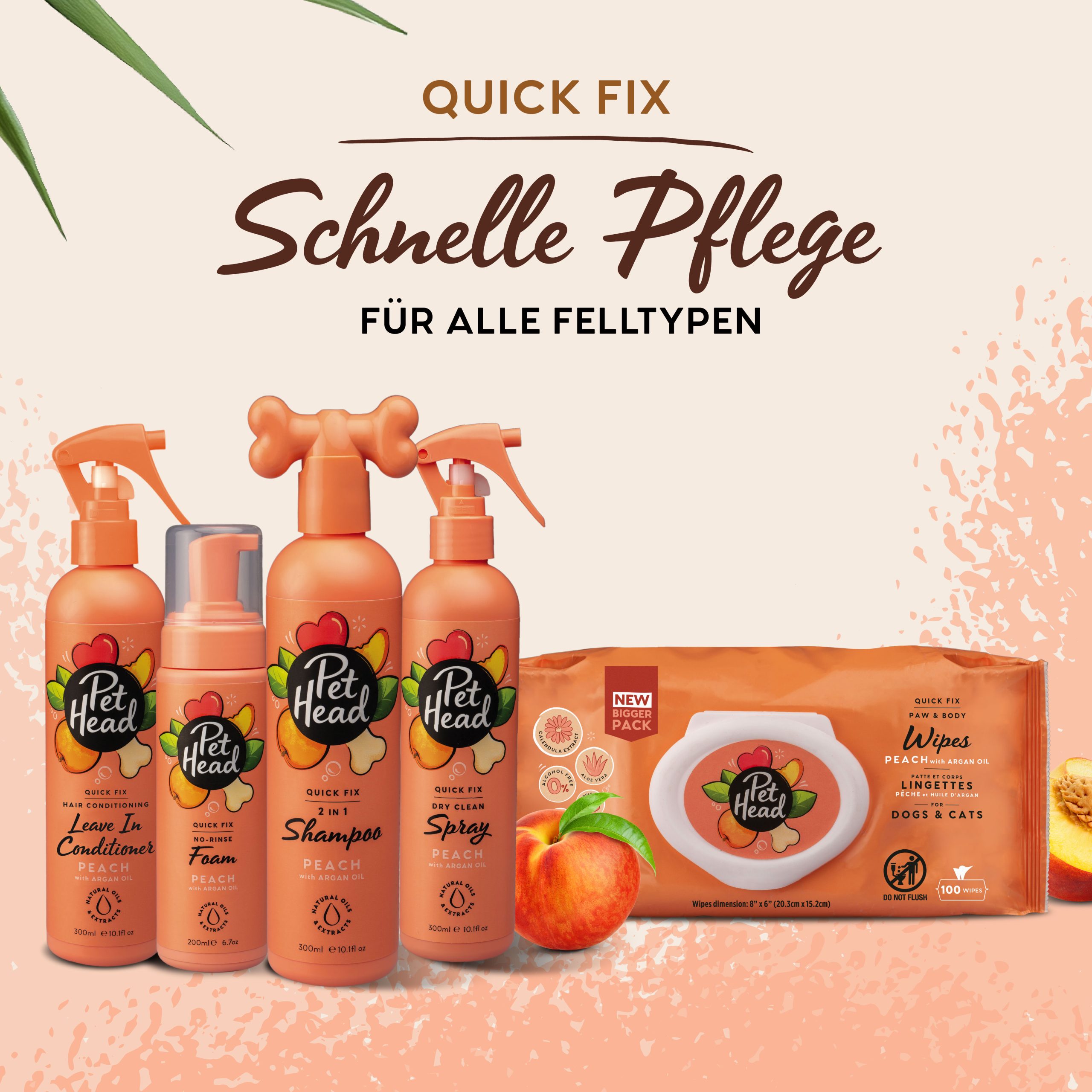 Unsere Quick Fix Serie ist perfekt, wenn du wenig Zeit hast. Das Quick Fix Trockenspray ist schnell und einfach anzuwenden und muss nicht ausgespült werden – ideal, um deinen Hund zwischen den Wäschen aufzufrischen. Ebenso sind unsere Quick Fix Reinigungstücher und der No Rinse Foam perfekt, um deinen Vierbeiner mit unserem herrlichen Pfirsichduft aufzufrischen. Unser 2-in-1 Shampoo & Conditioner spart außerdem Zeit, wenn es mal schnell gehen muss.