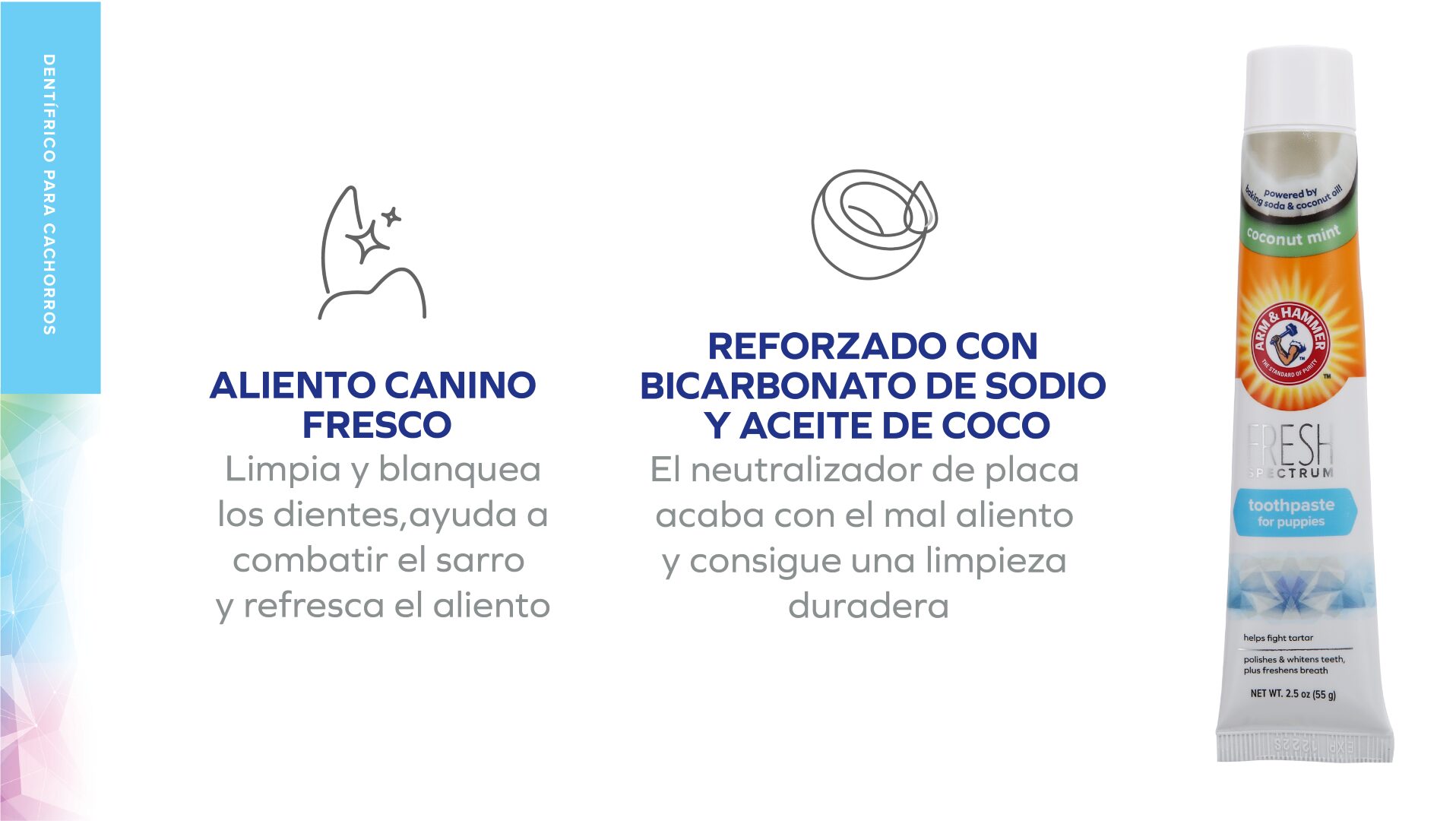 El dentífrico de menta para cachorros de Arm & Hammer contiene aceite de coco y bicarbonato de sodio, que ayudan a restaurar el equilibrio óptimo del pH bucal de tu mascota, neutralizando los ácidos nocivos y manteniendo el aliento fresco durante horas.