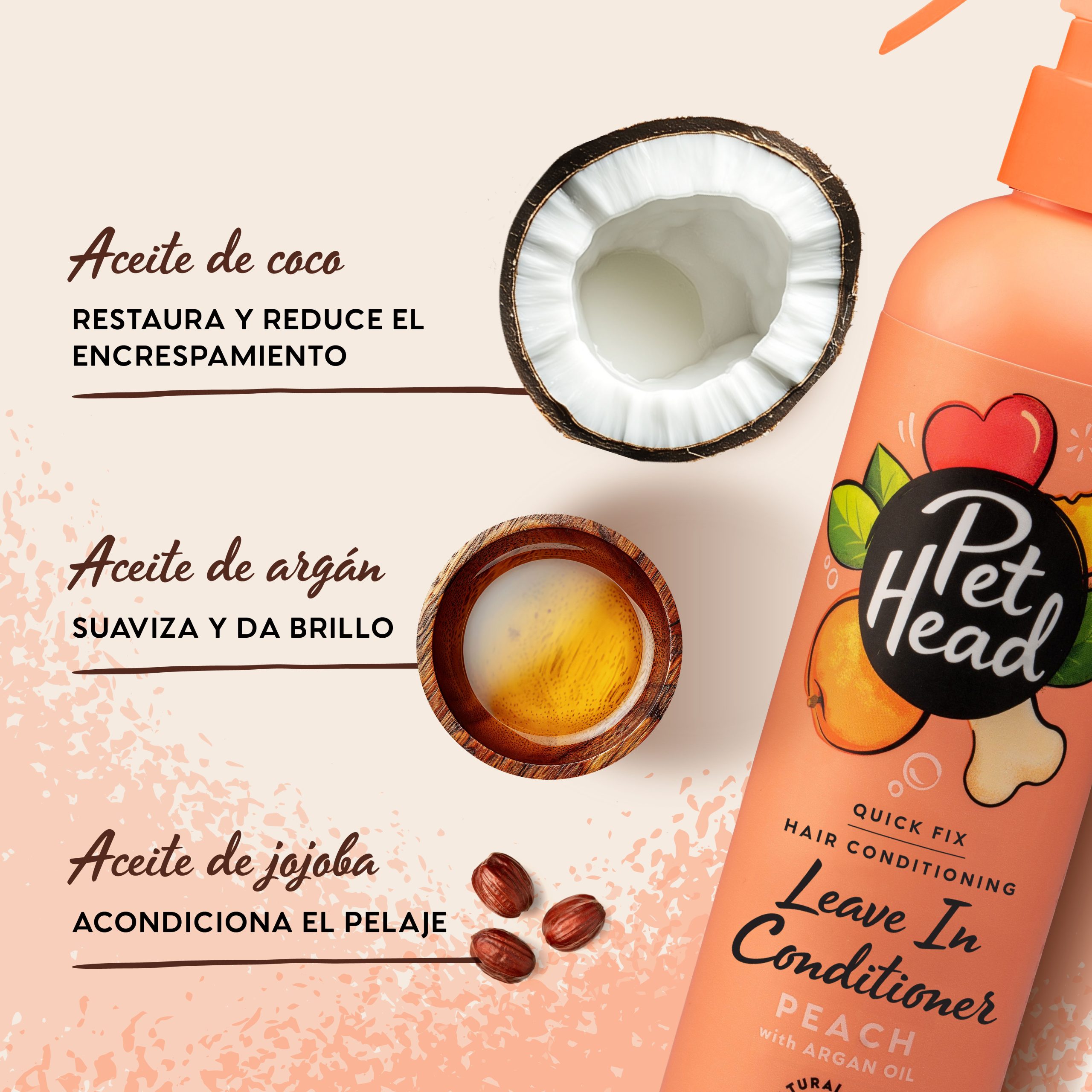 Un tratamiento acondicionador ligero todo en uno que no requiere enjuague. Proporciona una hidratación duradera para la piel y el pelo, rejuveneciendo los mantos apagados y sin vida y dejando un irresistible aroma a melocotón. Desenreda al instante y suaviza los pelitos sueltos para facilitar el cepillado o peinado. Puede utilizarse sobre el pelaje húmedo o seco, y no necesita aclarado.