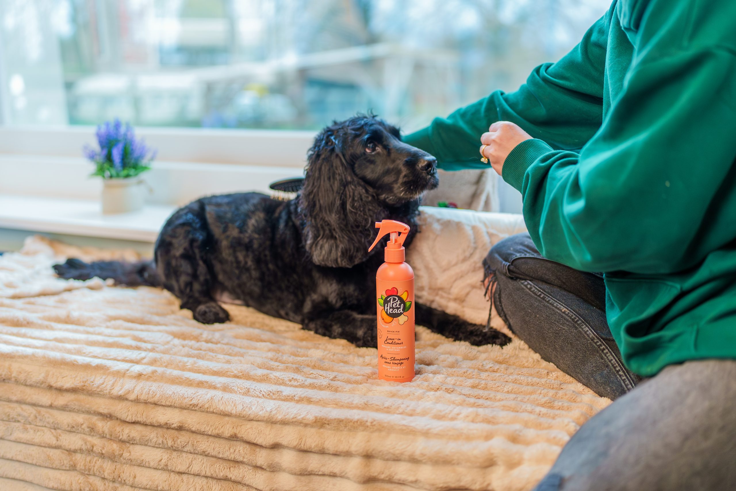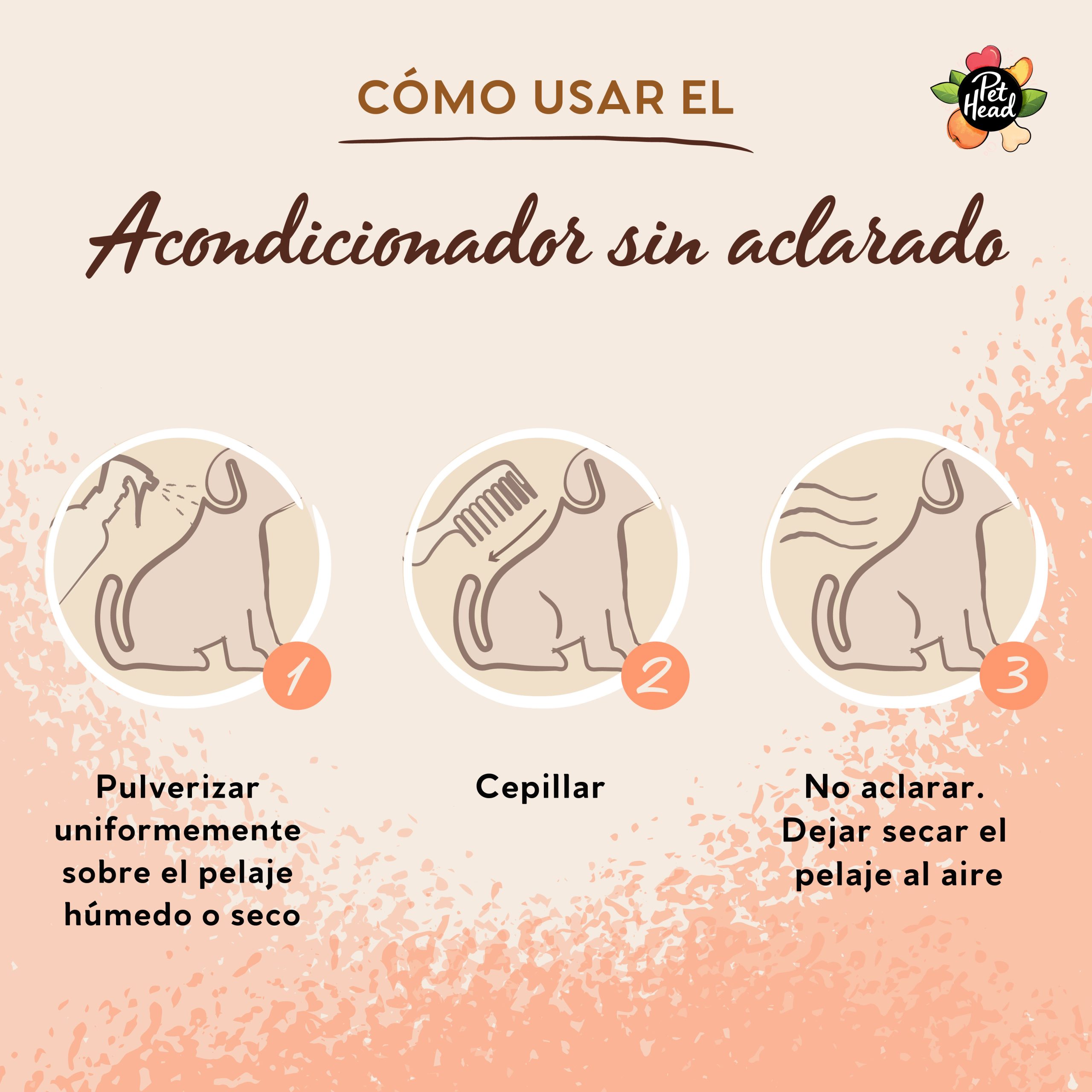 Rocía sobre el pelaje húmedo o seco, cepilla y deja secar. No necesita enjuague.