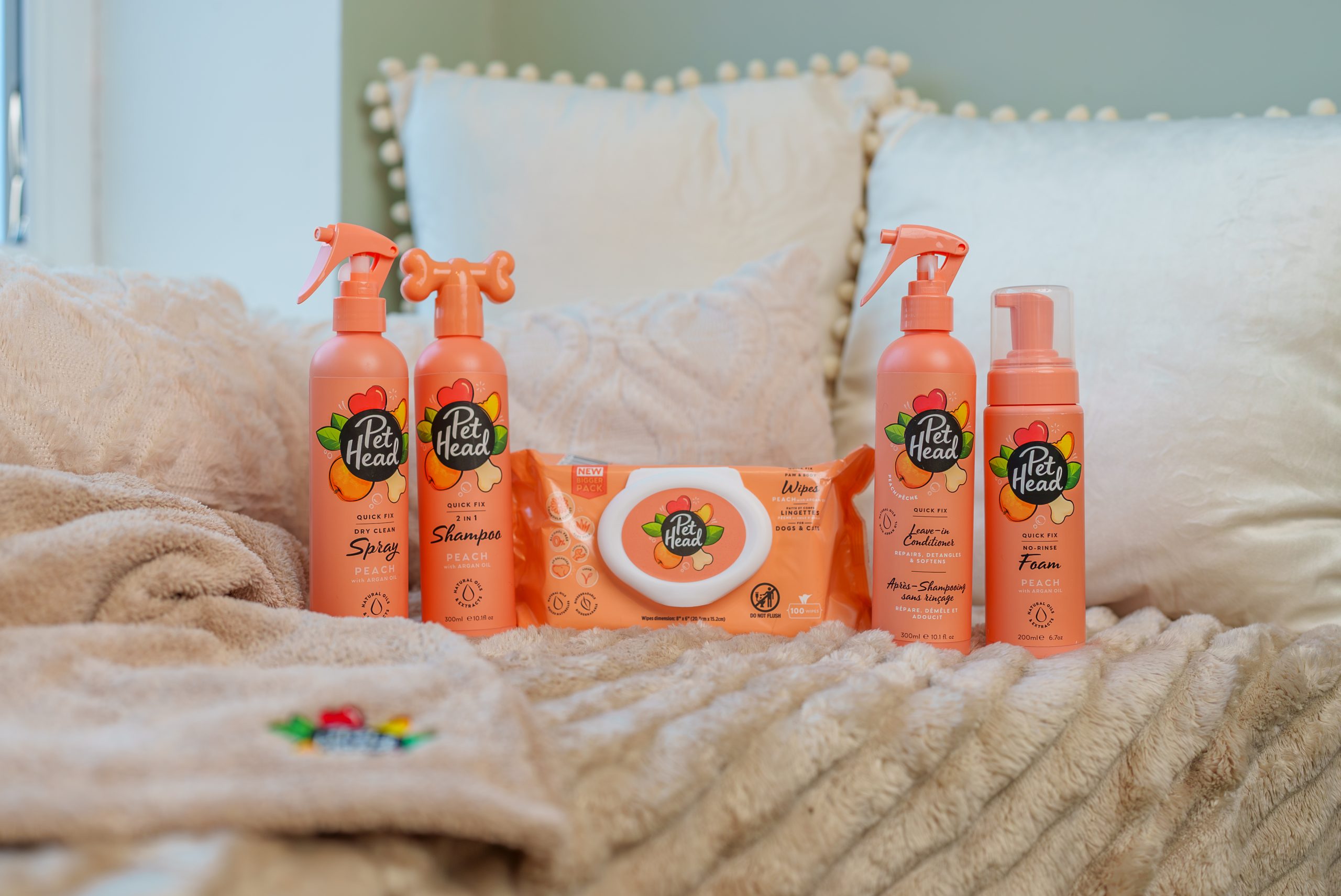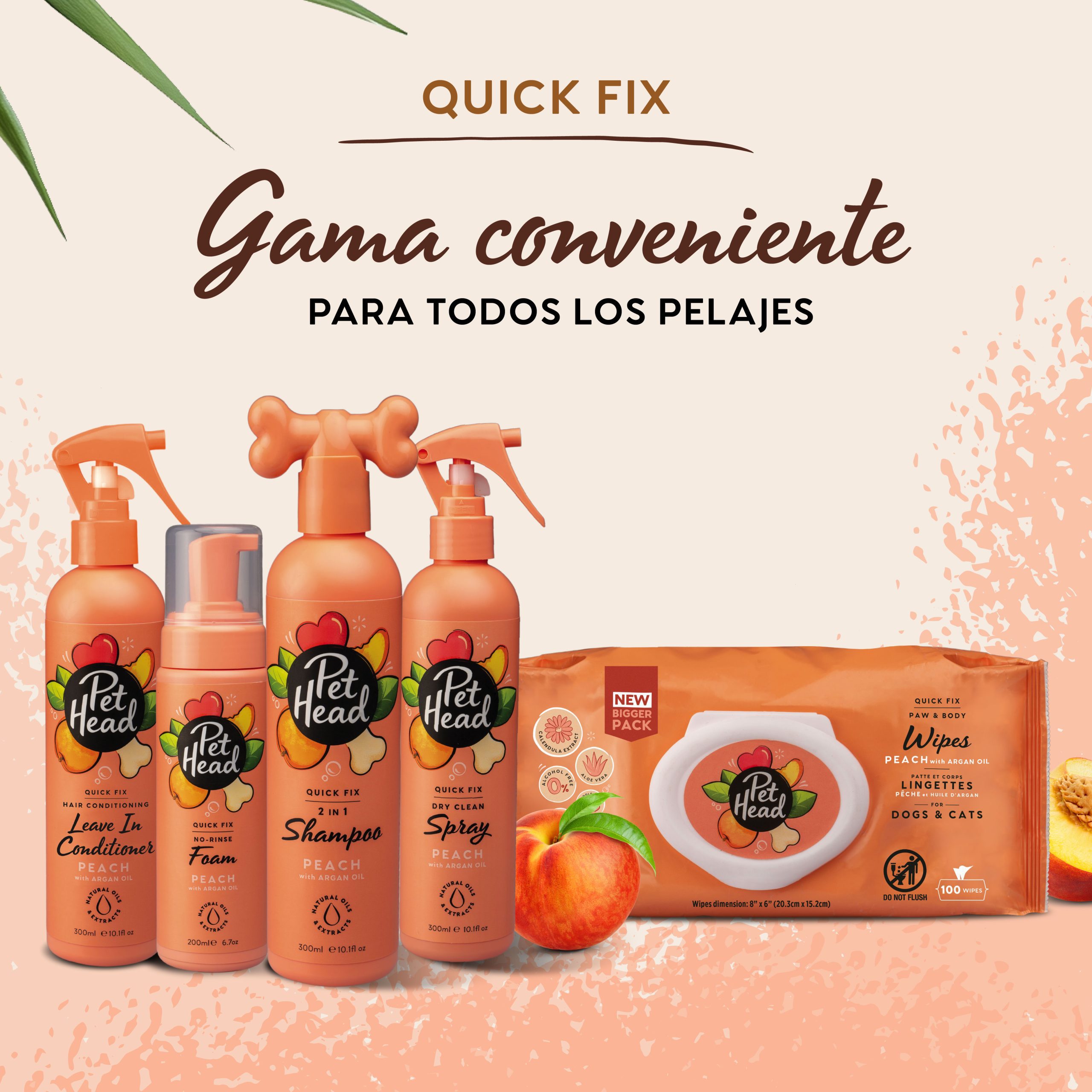 Nuestra gama Quick Fix es perfecta cuando tienes poco tiempo. Nuestro spray limpiador en seco es rápido y fácil de usar, no requiere enjuague y refresca a tu perro entre lavados. Del mismo modo, nuestras toallitas Quick Fix y la espuma sin aclarado son ideales para refrescar a tu mascota con nuestra increíble fragancia a melocotón. Además, nuestro champú y acondicionador 2 en 1 es un fantástico ahorro de tiempo cuando necesitas un lavado rápido.