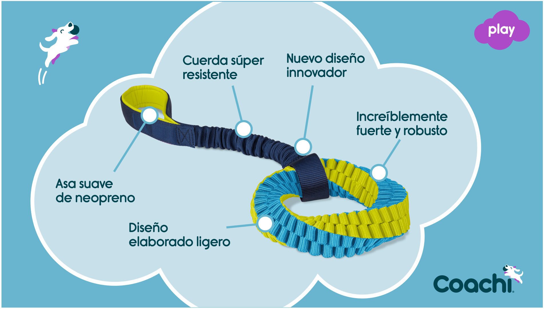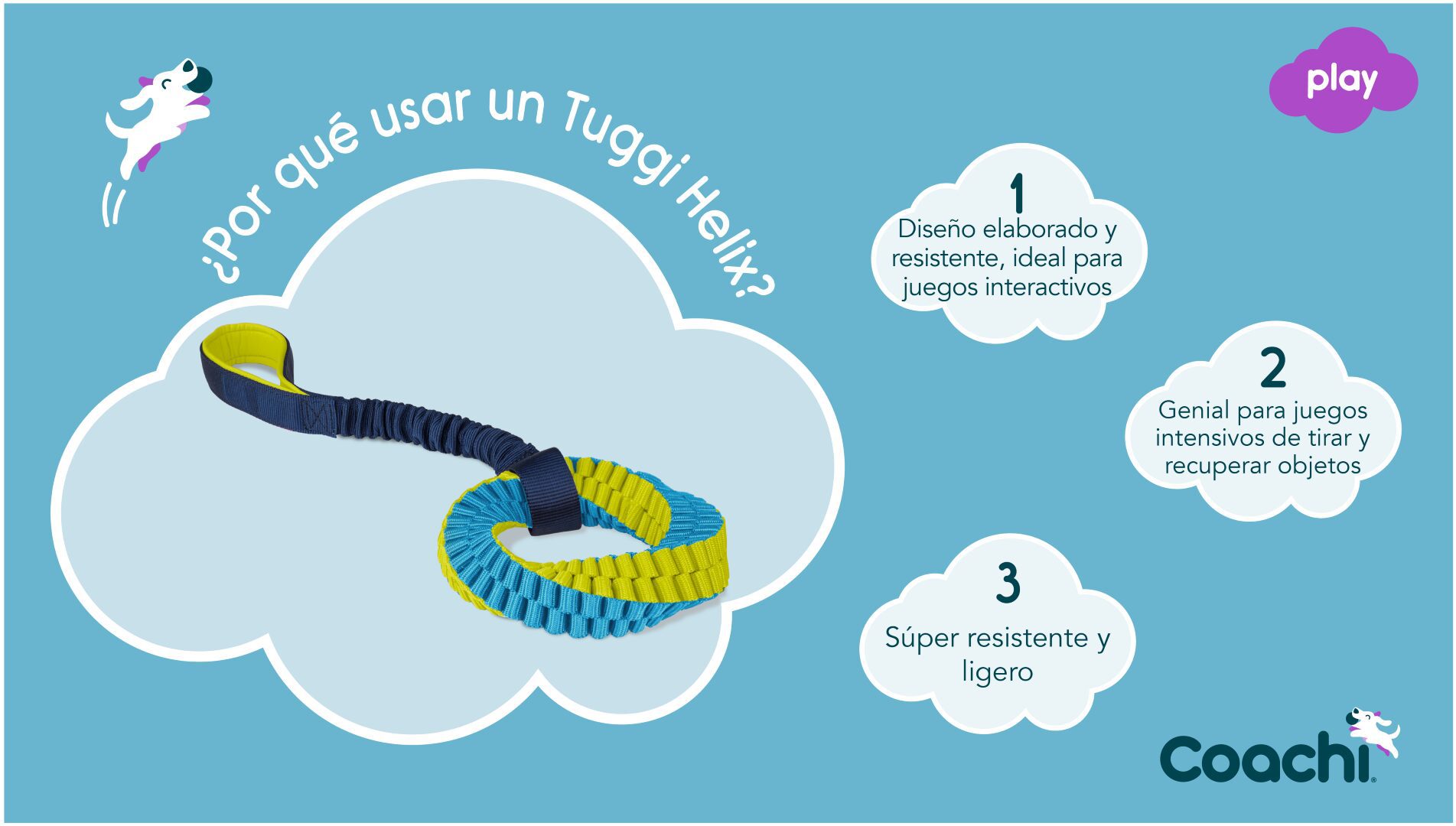 El Coachi Tuggi Helix es un juguete de tirar elástico con un diseño completamente nuevo e innovador. Es ligero, increíblemente resistente e incorpora una goma ultrarresistente y un asa suave de neopreno que protege tus brazos y el cuello del perro al jugar a tirar.