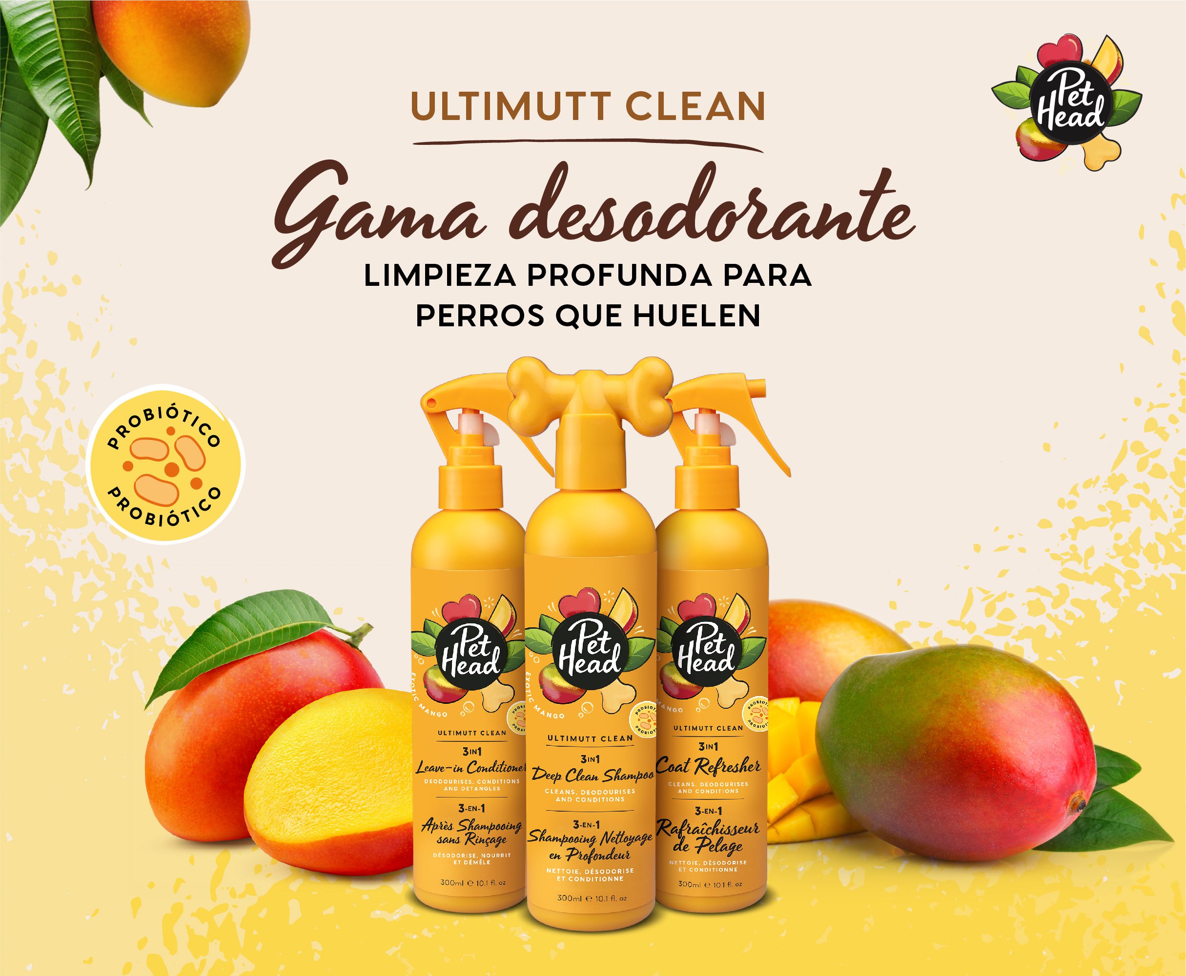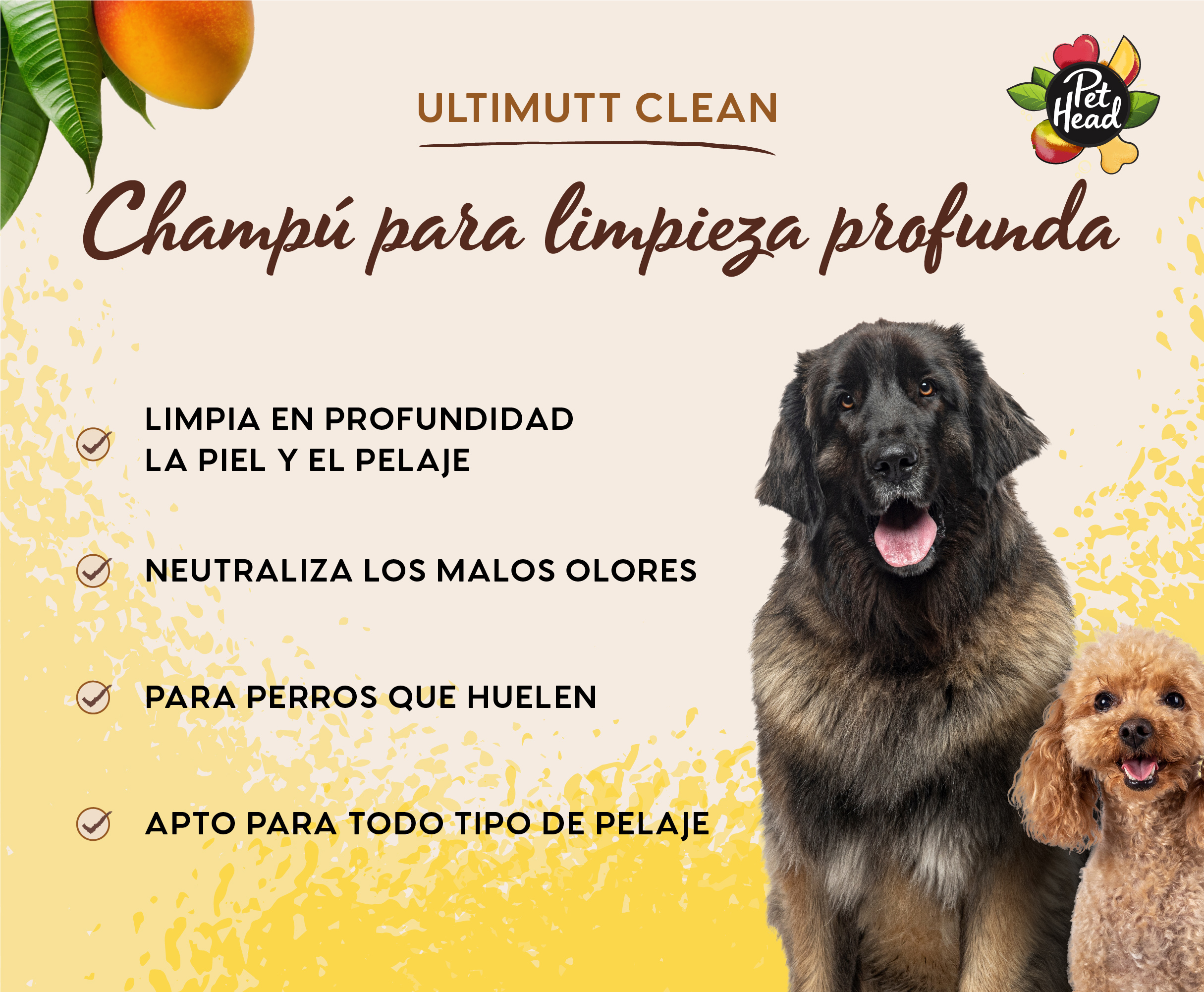 El champú Pet Head Ultimutt Clean está diseñado para una limpieza profunda, eliminando suciedad, grasa y restos incrustados, a la vez que desodoriza y acondiciona el pelaje. Es especialmente adecuado para pelajes grasos, muy sucios o espesos, y para perros que nadan, se revuelcan o se ensucian con barro con frecuencia.