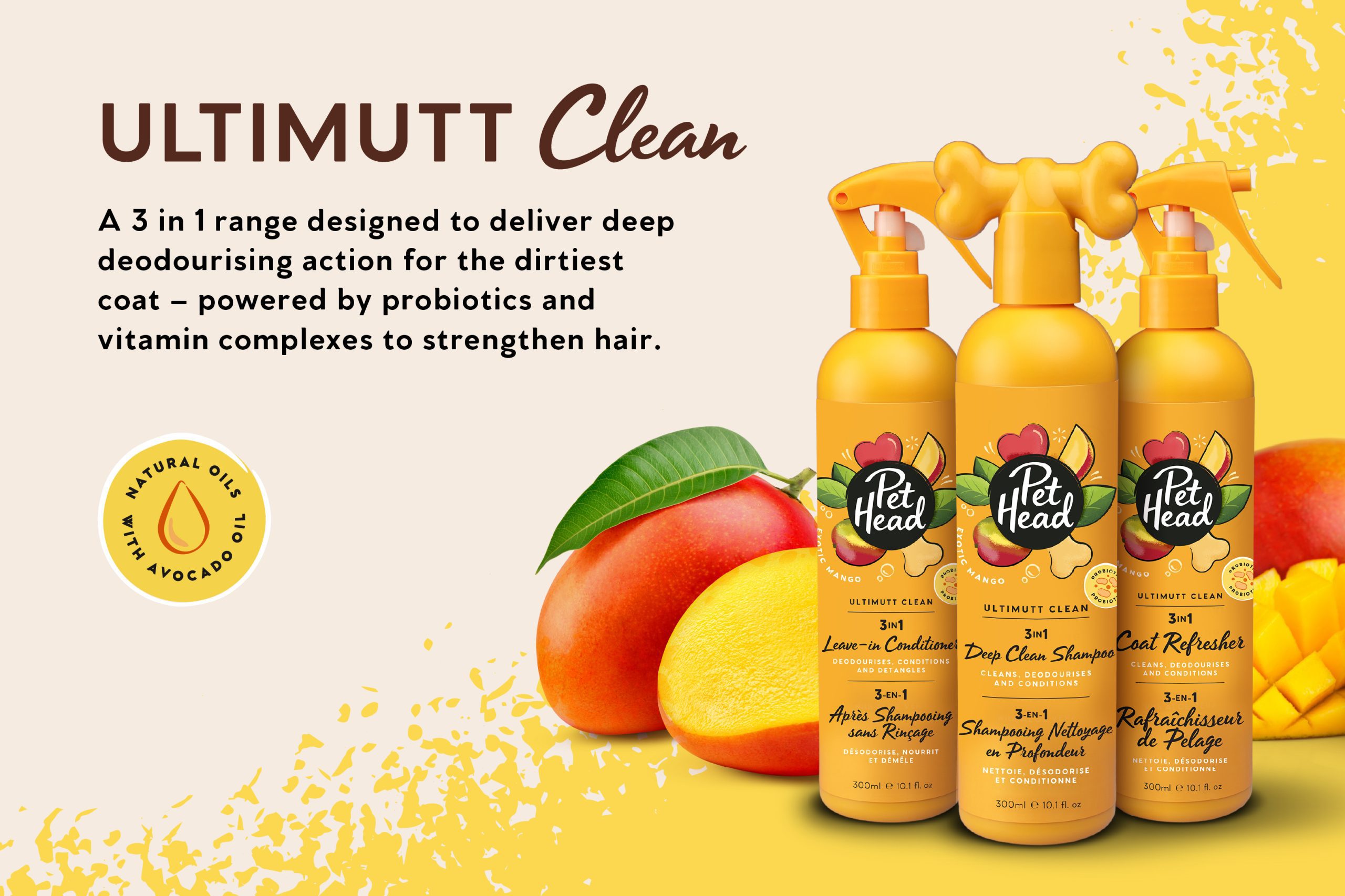 LIMPIEZA EN PROFUNDIDAD, DESODORIZA Y CONDICIONA. El Spray Refrescante de pelaje Ultimutt Clean limpia y purifica profundamente el pelo, eliminando la suciedad, la grasa y la mugre mientras deja el pelaje suave, limpio e hidratado.