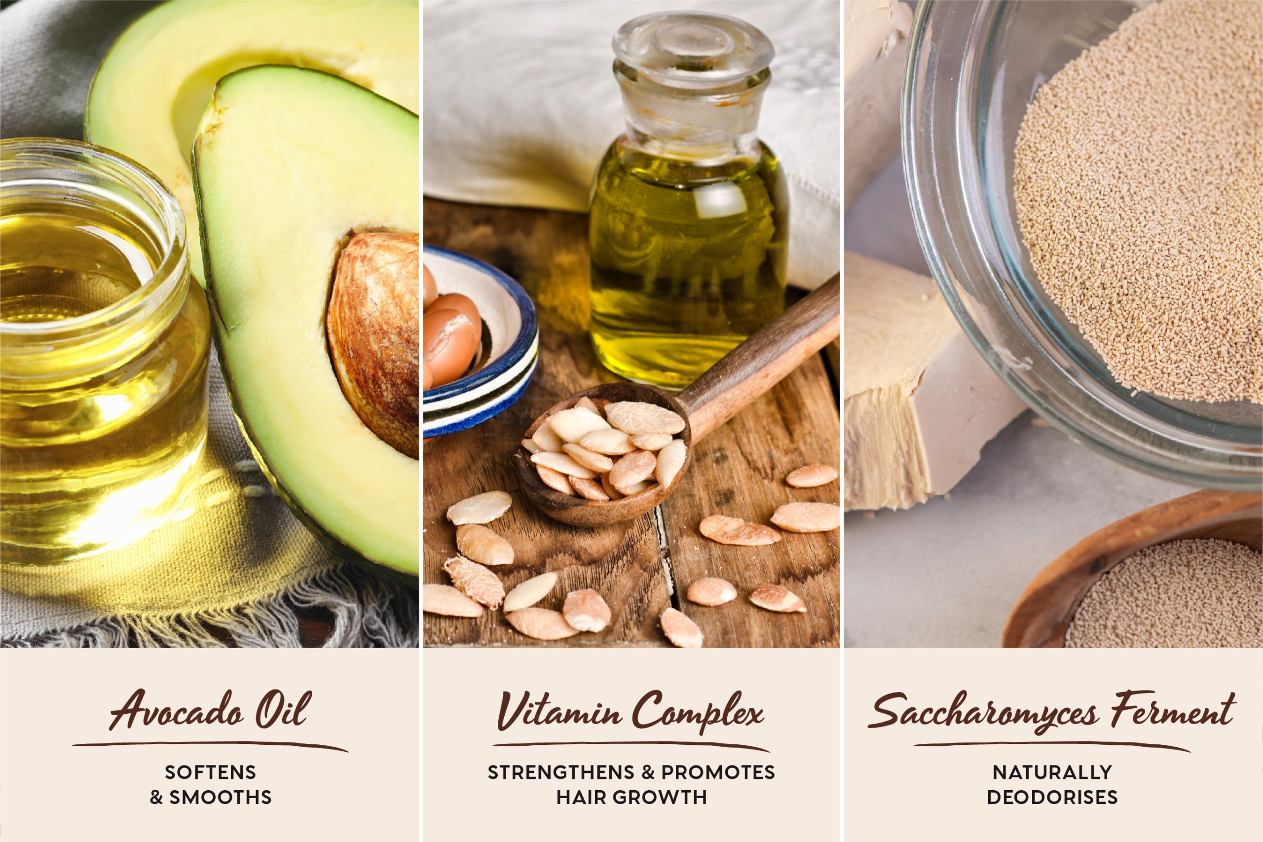 Enriquecido con aceite de aguacate y un complejo de vitaminas (B3, B5, B6 y E) para suavizar y fortalecer el cabello, promoviendo su crecimiento. Con fermento de Saccharomyces, que es un desodorante natural que neutraliza y elimina olores no deseados.