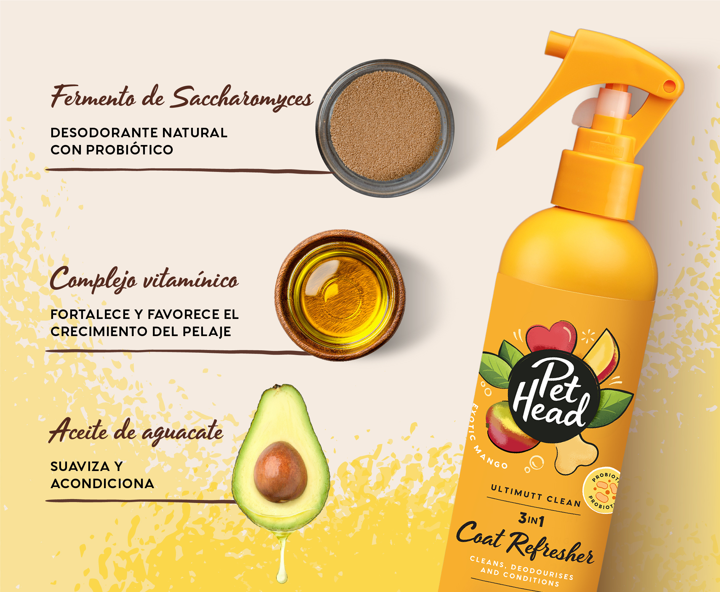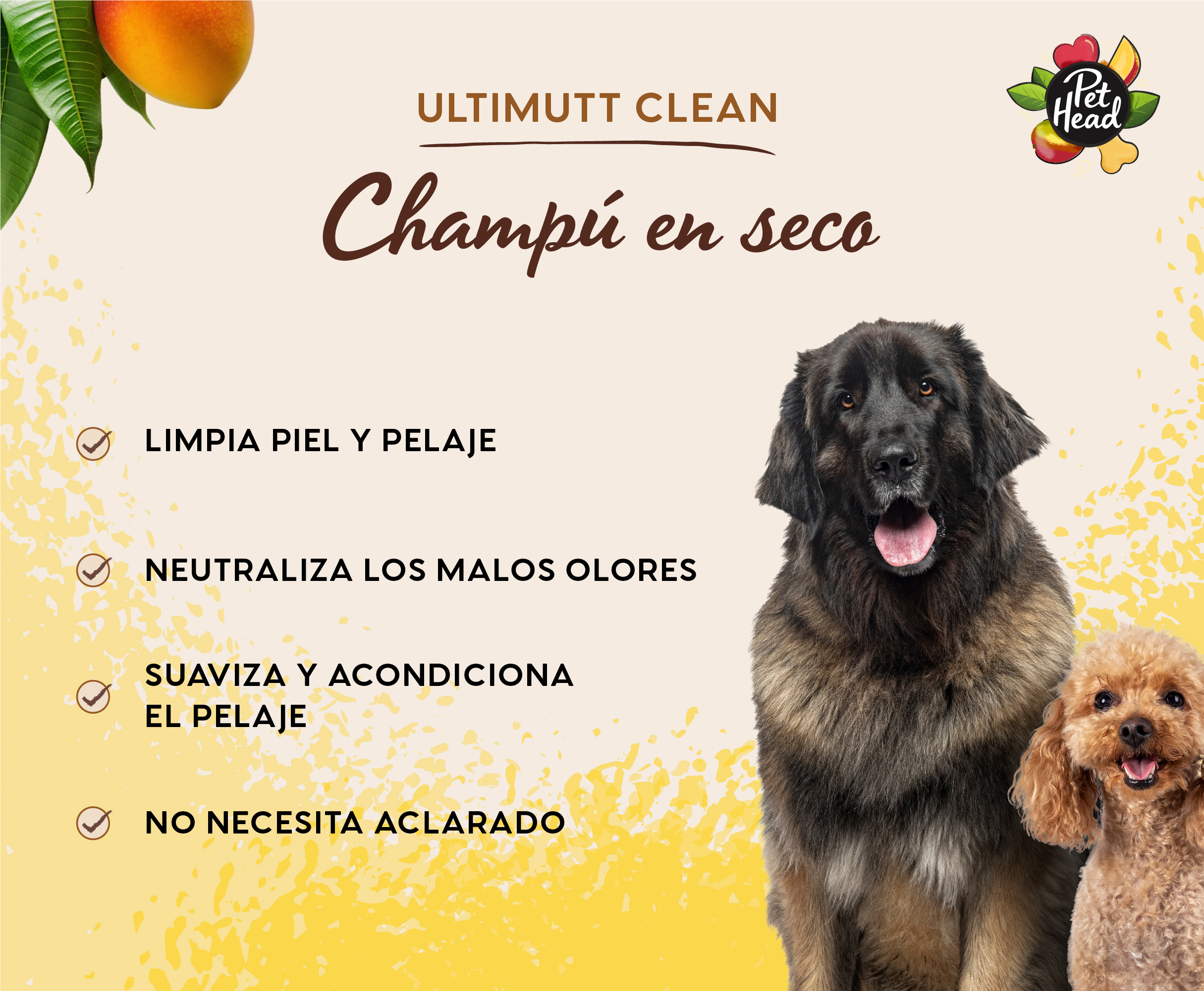 Pet Head Ultimutt Clean Coat Refresher está diseñado para limpiezas rápidas entre baños. Ayuda a eliminar la suciedad y los malos olores, acondiciona el pelaje y deja el pelo fresco y fácil de manejar. Es ideal para mantener a los perros limpios entre lavados, especialmente aquellos con pelaje graso, pelo espeso o un estilo de vida activo y propenso a ensuciarse.