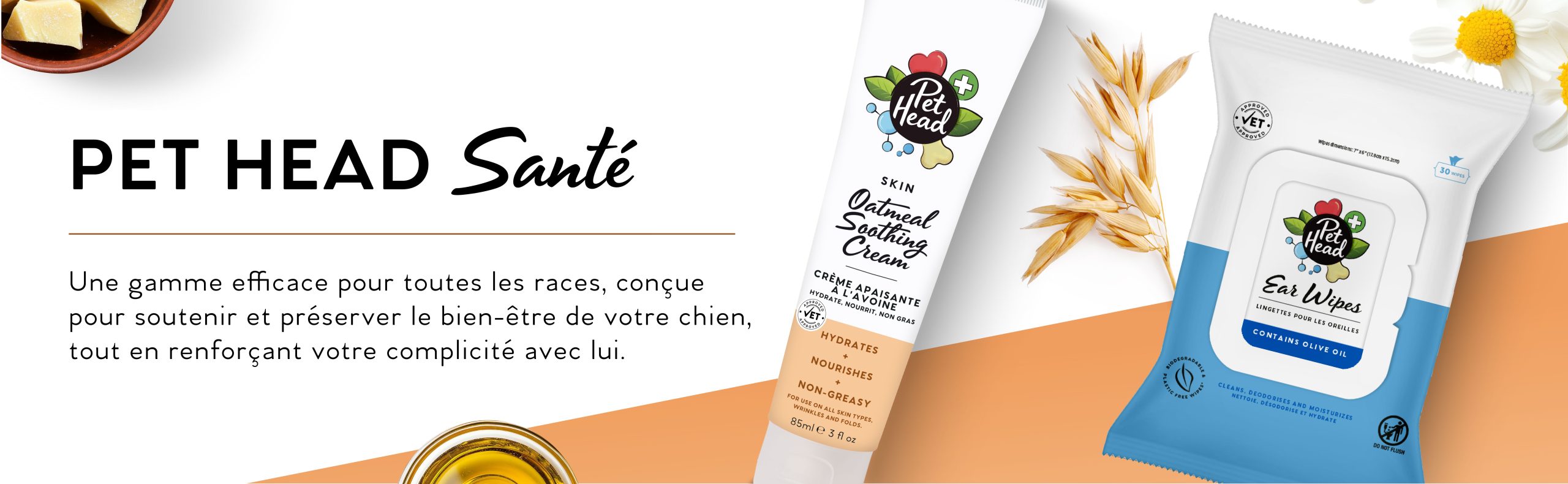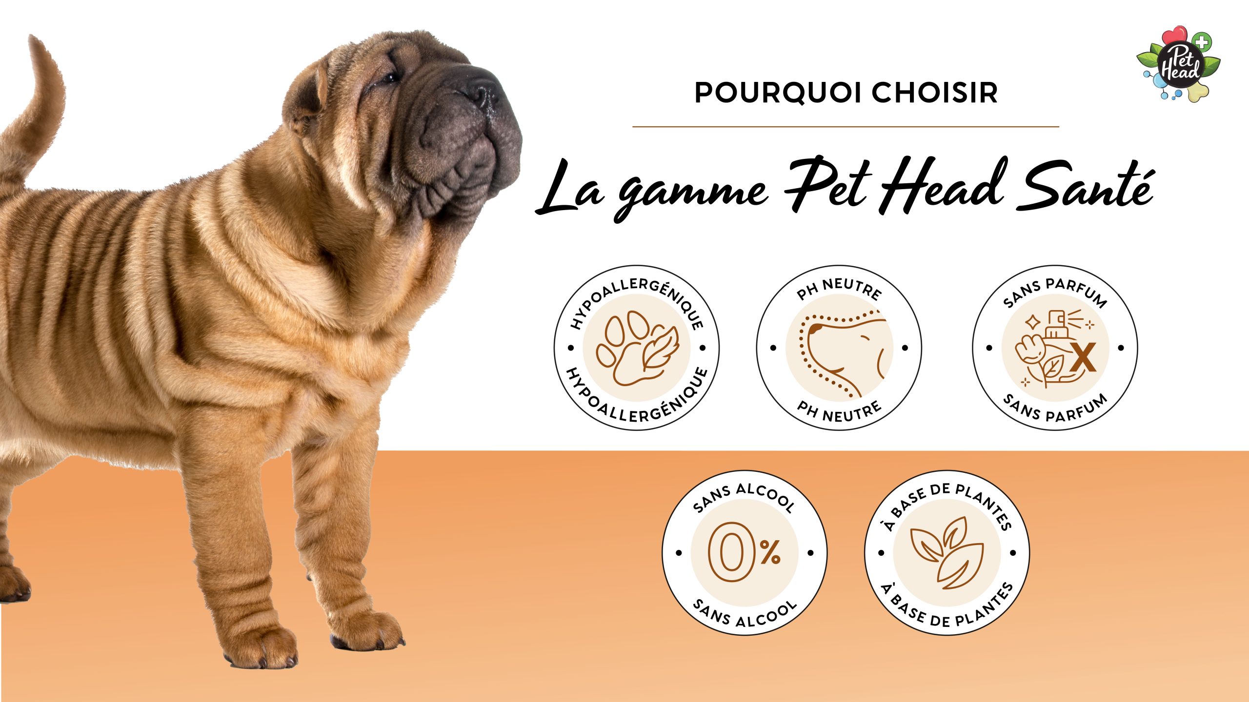 Les produits destinés à une utilisation par des humains peuvent être néfastes pour les chiens en raison de leurs besoins cutanés spécifiques et de leurs pH différents de ceux des humains. De plus, ces produits peuvent contenir des substances qui peuvent être irritantes ou toxiques pour les chiens lorsqu’ils sont léchés. Tous les produits Pet Head ont été développés pour répondre aux besoins physiologiques et dermatologiques des chiens en sélectionnant avec soin des ingrédients sûrs et adaptés.