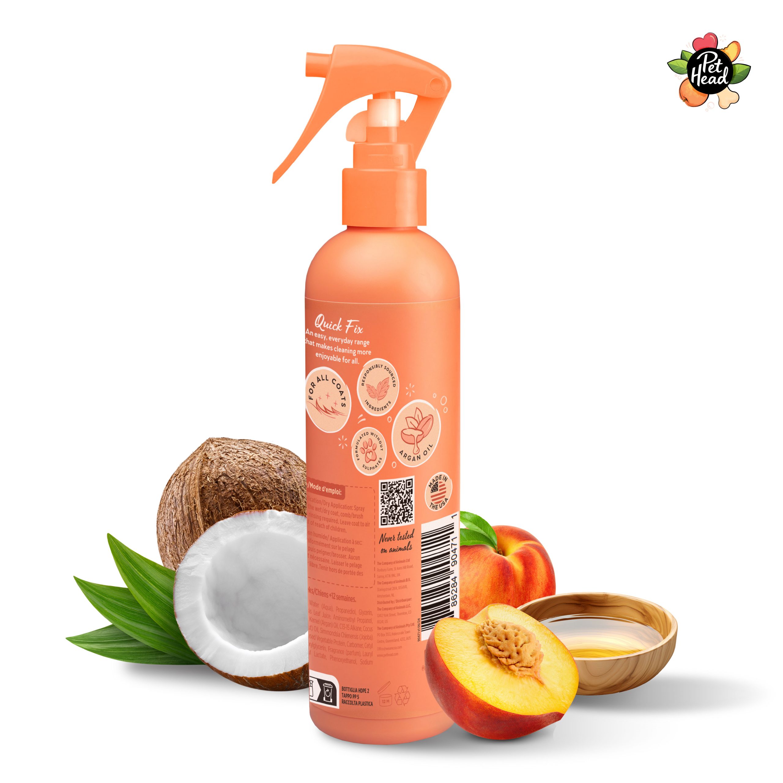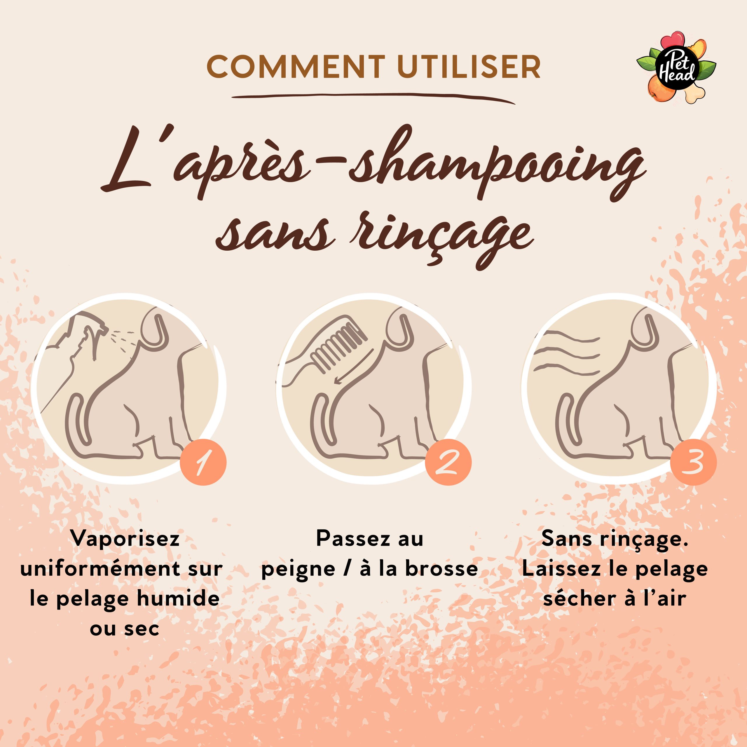 Vous pouvez l’utiliser après le bain pour faciliter le démêlage ou entre deux lavages pour entretenir le pelage sain et soyeux au quotidien. Vaporisez sur poils secs ou mouillés, brossez, laissez sécher… et le tour est joué. Aucun rinçage nécessaire!