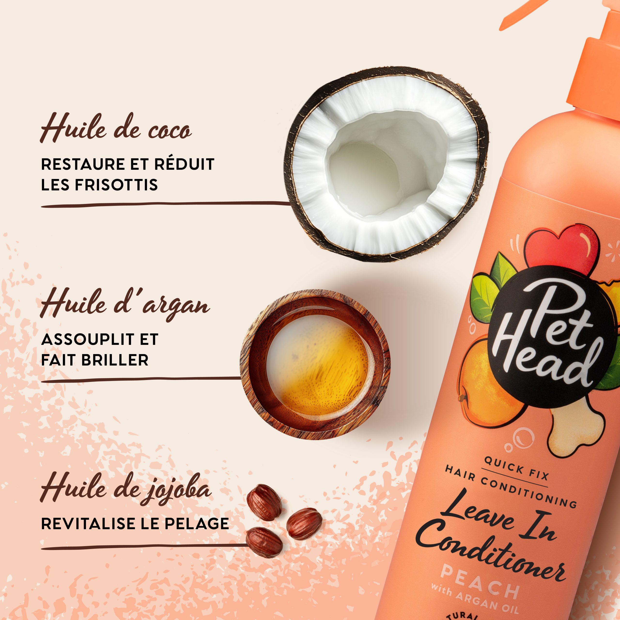 La gamme Quick Fix est enrichie en trois huiles exceptionnelles : argan, coco et jojoba, qui nourrissent et adoucissent la peau et le pelage de votre chien. Elle contient également de l’aloe vera, aux propriétés apaisantes et adoucissantes, ainsi que des protéines végétales qui renforcent et hydratent le poil.