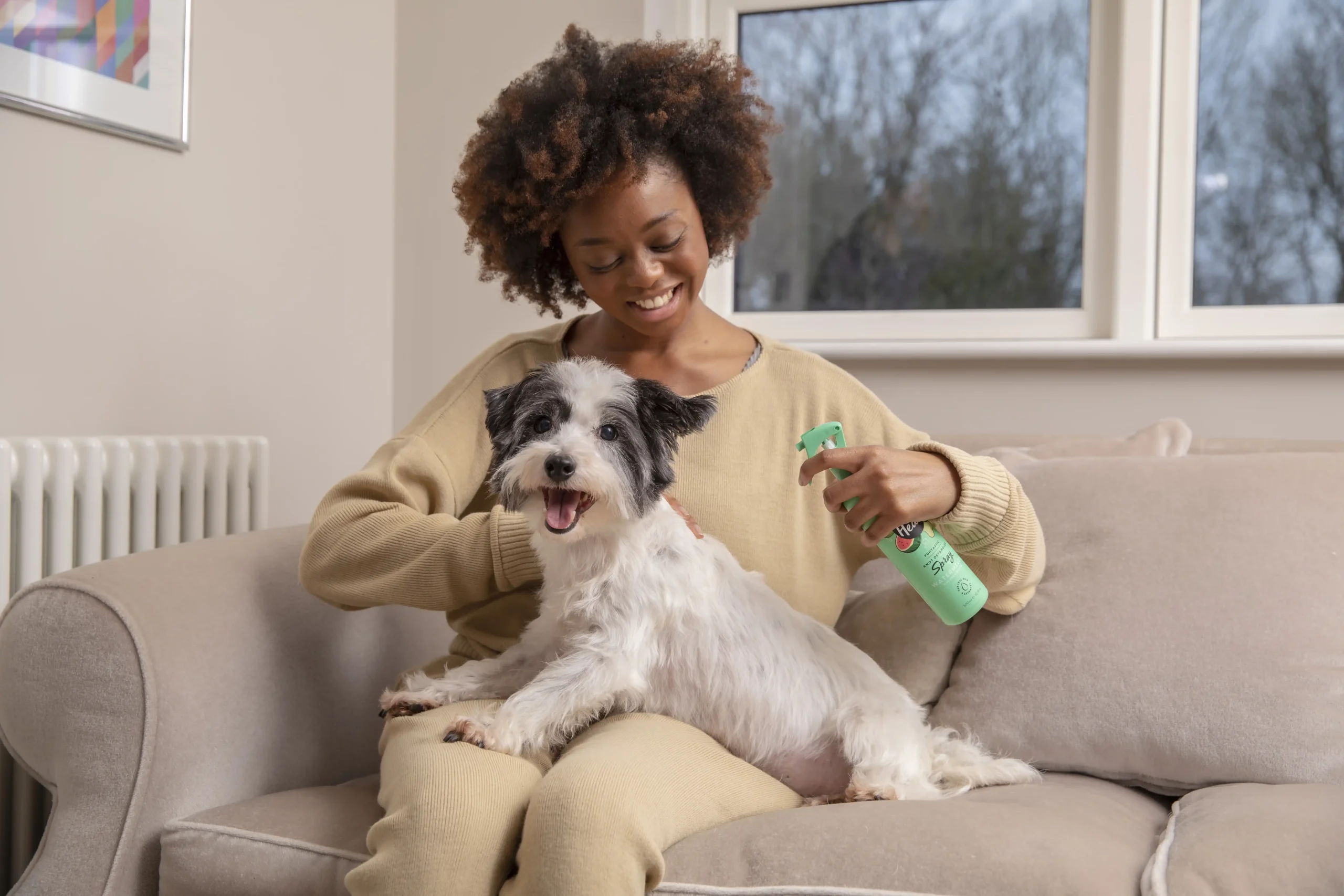 Dog wipes are the most practical everyday tool – they remove dirt, pollen, and surface residue from paws, faces, and coats without water. A coat refresher like Pet Head Ultimutt Clean Coat Refresher manages odour between wash days without disrupting the skin. For coats that tangle, a leave-in conditioner applied to a wet or dry coat keeps fur manageable and reduces the pulling that makes brushing uncomfortable.
