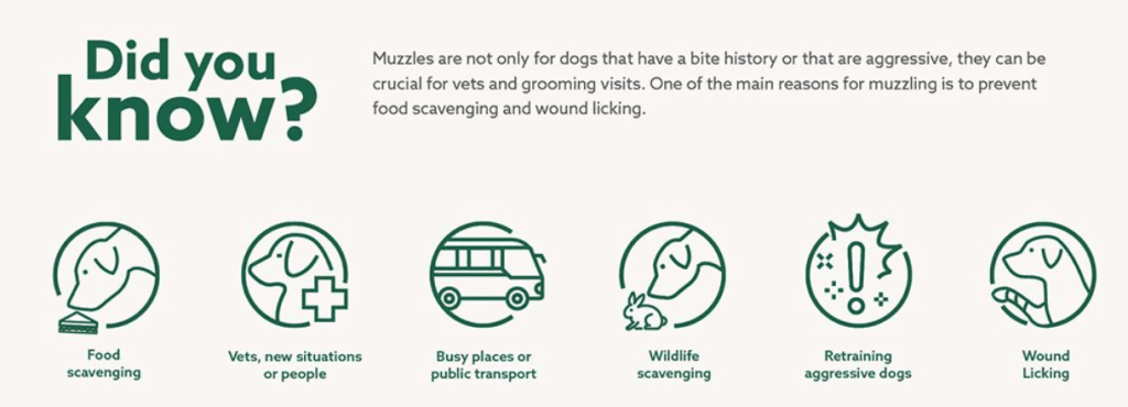 If you’re working on behaviour issues with a dog who has shown inclination to bite, a muzzle stops them from biting and provides a safety net during training. It allows you to work on the underlying behaviour without risk of injury, and can help anxious owners relax – which in turn helps their dogs stay calmer.