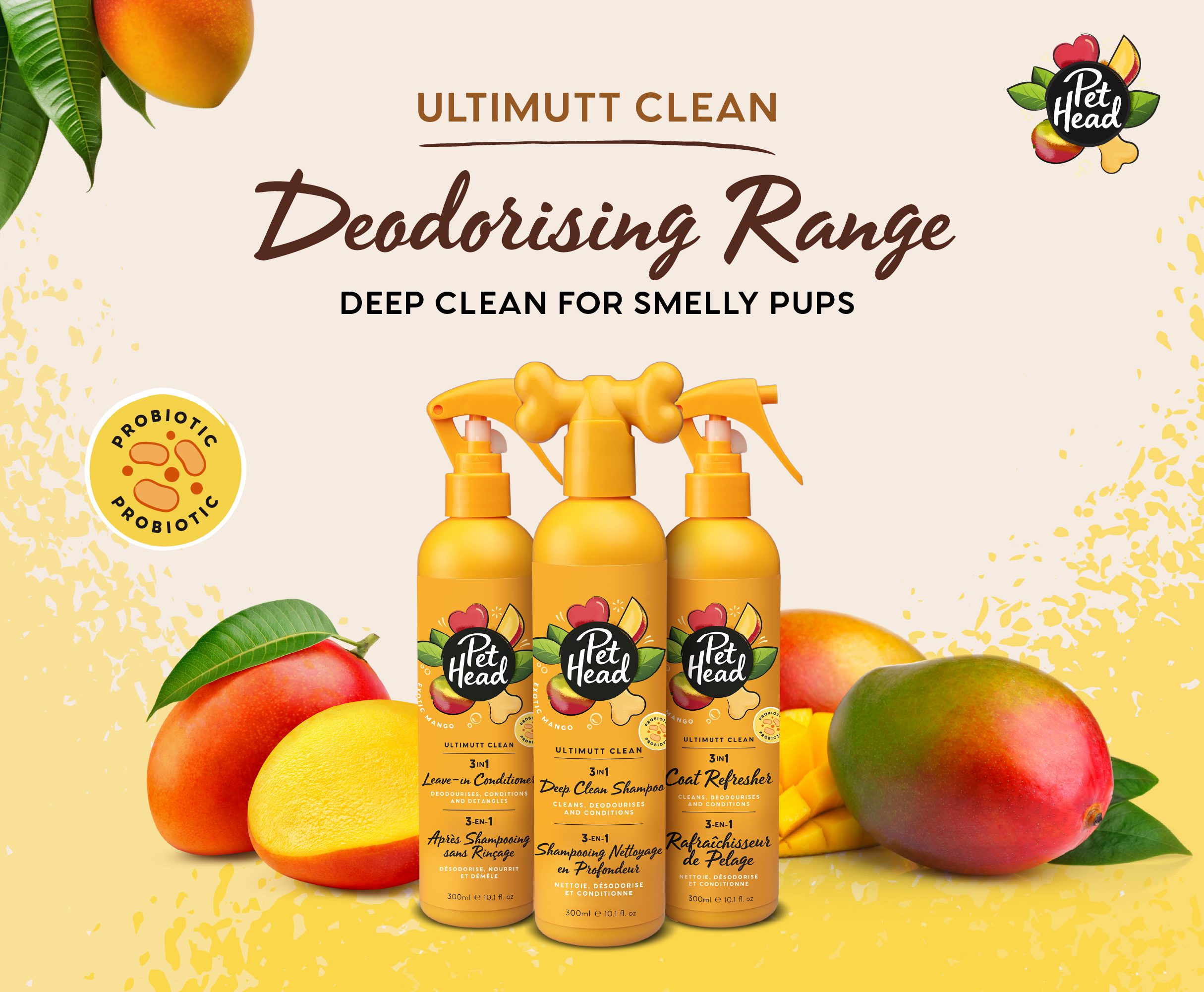 The tropical fragrance lasts, while the deodourising action neutralises odours at the source, perfect for even the smelliest, mud-loving dogs.
